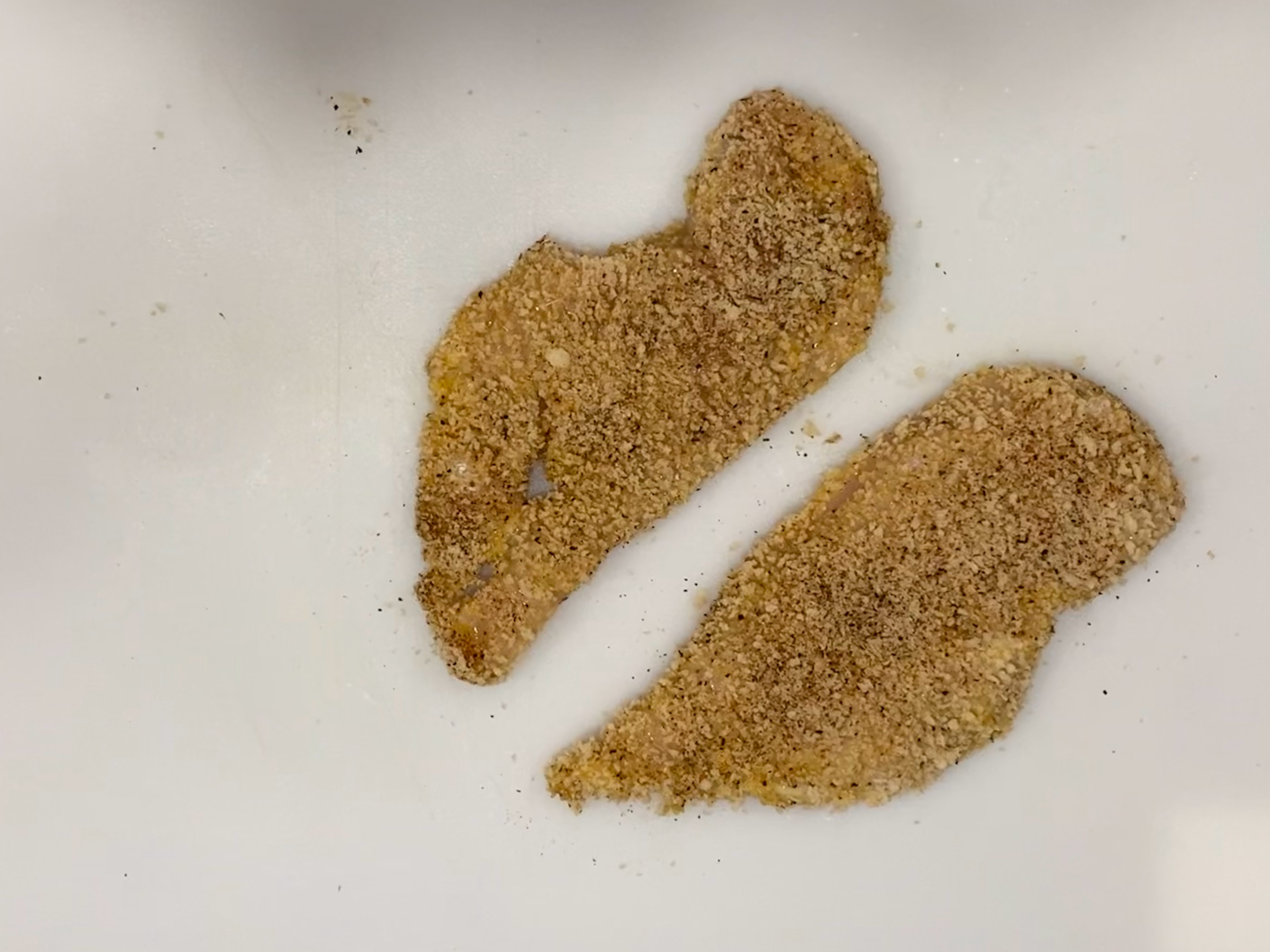 Preheat air fryer to 350 degrees. Halve a single chicken breast length-wise to make 2 thin filets. Cover each chicken filet with flour, then move flour-covered chicken into the egg, and finally move the egg-covered chicken filet into the seasoned panko mixture. Repeat for the second filet. Place both breaded chicken filets into air fryer until reaching an internal temperature of 165 degrees.